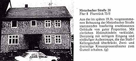 Das Gemeindehaus wurde im späten 19. Jh., im Rahmen der Bebauung der Metzebacher Straße errichtet. Die Gemeinde hatte die soziale Verpflichtung einkommensschwachen und wohnungslosen Bürgern eine Unterkunft zu gewähren.